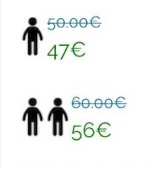 Els preus son: 1 persona 47€/15 min. 2 persones 56€/15min